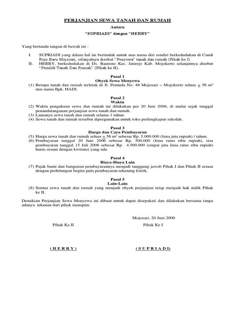 Contoh Surat Perjanjian Sewa Kedai Atau Rumah from imgv2-2-f.scribdassets.com Salah satu alat kelengkapannya adalah surat perjanjian mungkin banyak yang menyepelekan surat perjanjian kontrak rumah saat hendak menyewa sebuah hunian. Perjanjian sewa rumah adalah satu akad kontrak yang boleh dilakukan antara (anda) tuan rumah dan penyewa anda (si penyewa), jadi segalan peraturan, syarat, atau apa jua tanggugungjawab dan klausa yang ada dalam surat perjanjian sewa rumah tersebut perlu dipatuhi oleh penyewa. Dokumen ini yang juga dikenali sebagai 'tenancy agreement' yang menjadi kontrak antara tuan rumah dan penyewa secara bertulis. Yang bertandatangan di bawah ini : Acuan pembuatan surat perjanjian sewa rumah ini memiliki poin penting yang harus tercantum dalam surat tersebut. Membuat surat perjanjian sewa rumah untuk pertama kalinya tentu tidak mudah. Surat perjanjian sewa rumah adalah dokumen yang mengatur kesepakatan sewa rumah antara penyewa dan pemilik rumah. Ramai di antara kita memerlukan dokumen surat perjanjian sewa rumah sama ada sebagai pemilik rumah mahupun penyewa.